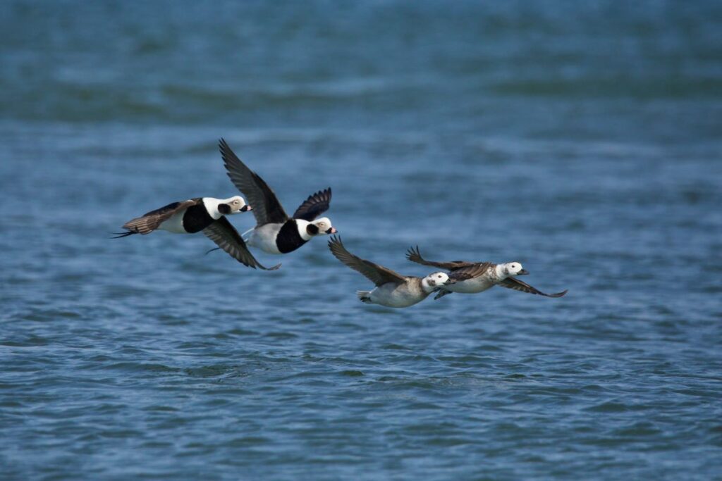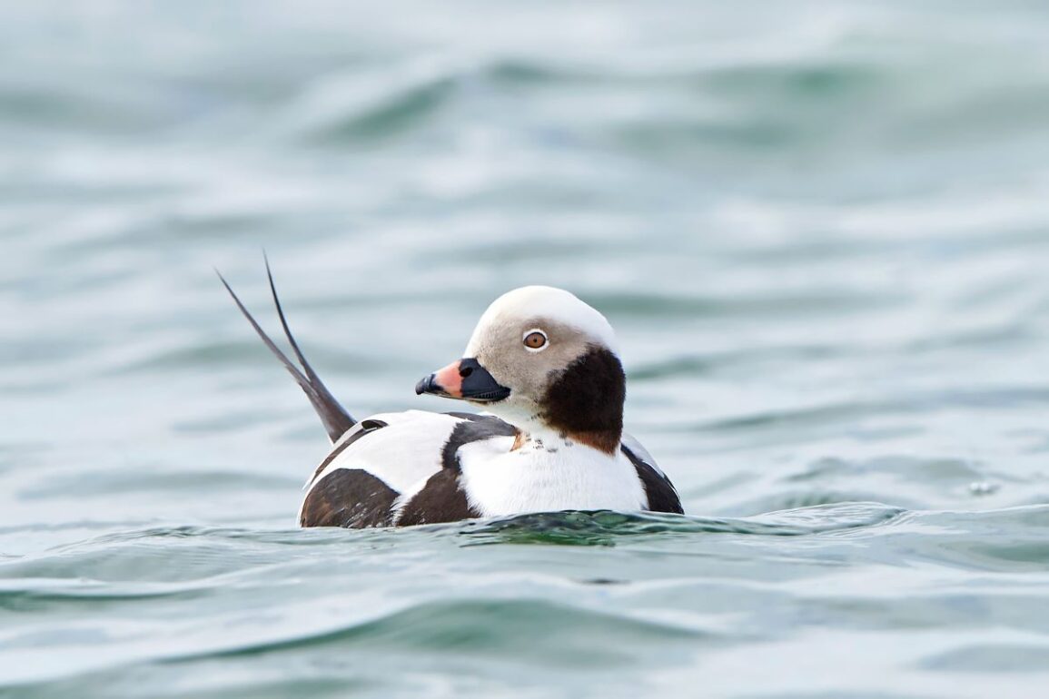 Long-tailed ducks (Clangula hyemalis) are small, compact diving ducks with rounded heads and short bills. Males in winter wear crisp black-and-white plumage with a pale face patch and – true to their name – two slim, extended tail feathers that trail like ribbons when they lift off the water. Females are subtler: chocolate-brown cap, pale cheeks and a neat, dark smudge on the face. Both sexes can cycle through multiple plumages across the year, so field marks are more reliable than overall colour.