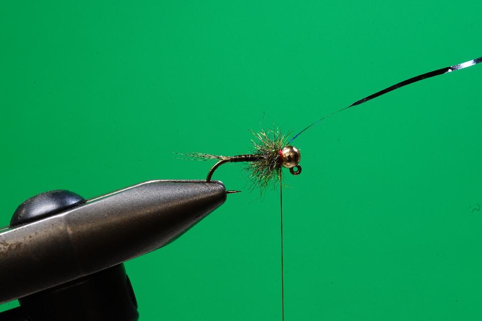Wind the dubbed thread forward to form a scruffy thorax. Using a dubbing brush or Velcro, roughen the thorax to free any trapped fibers. Pull the wingcase over the top of the thorax. Tie down the wingcase directly behind the bead using 2-3 thread wraps. Fold the excess wingcase material back over itself and lock in place with 2-3 thread wraps. Trim the excess wingcase material.