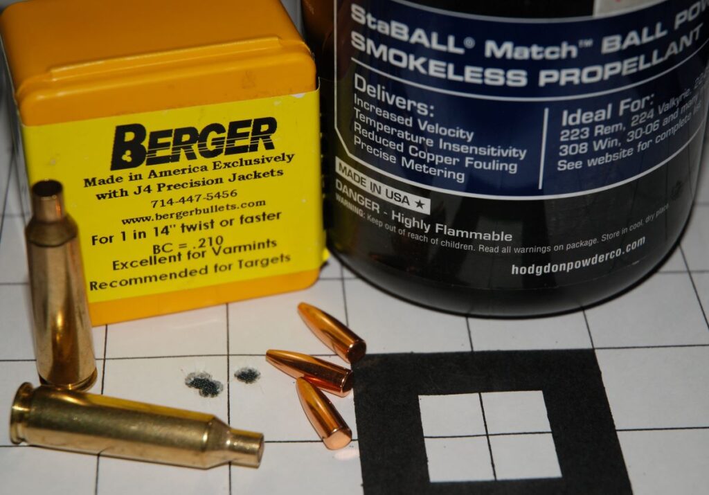 | Berger 52-grain Varmint Match | Varget | Hornady | 3,477 | .930 |