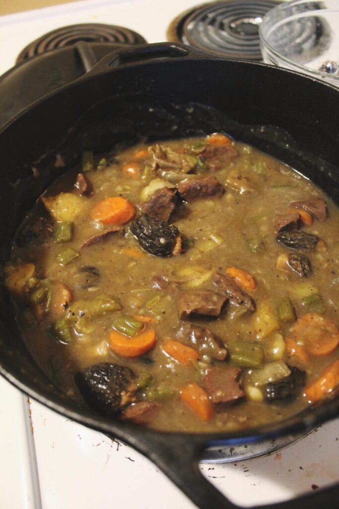 Cut a cleaned venison heart into bite-size pieces (if you need any tips, check out how to prepare a venison heart here.) Heat several tablespoons of olive oil in a Dutch oven over medium-high heat on the stovetop. Brown the heart for approximately five minutes and remove from the pan. Sauté the onions and morels for around five minutes, adding the garlic in and cooking for another minute. Put the heart back into the pan, as well as the broth, potatoes, carrots and celery.
