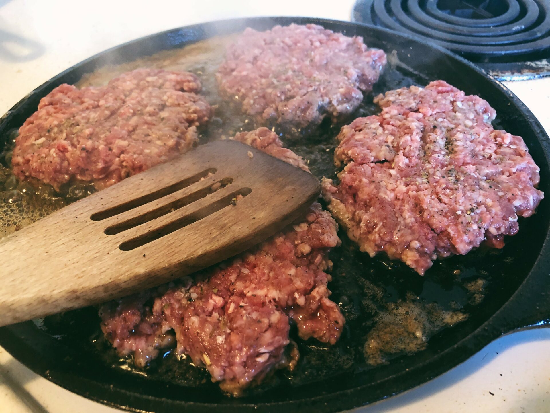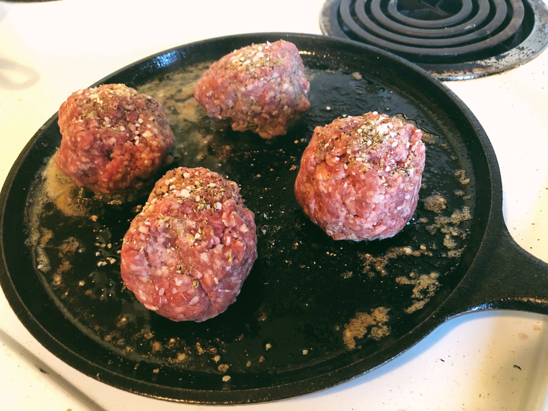 Heat up a cast iron pan over medium heat and melt the butter. While the pan is preheating, separate the ground meat into 4-ounce portions. Season one side with dried herbs, salt and pepper, and place the seasoned side down into the pan. Season the other side. Use a spatula, wooden spoon – whatever you have on hand – to smash down the burger into a thin patty. Cook until charcoaled and crisp on one side (around five minutes) then flip to the other side for another few minutes. Lay the sliced cheese on top of burgers, then cover the pan to allow the cheese to melt and the burgers to steam until the cheese is melted.